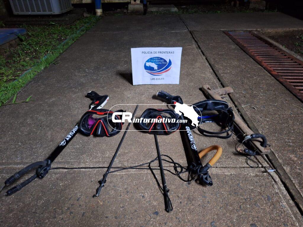 De igual manera los agentes fronterizos aprehendieron a un tercer nicaragüense, quien viajaba como acompañante en una de las motos, pues portaba varias artes de pesca ilegales, entre estas tres arbaletas y una atarraya, además de tres máscaras y 15 pescados.