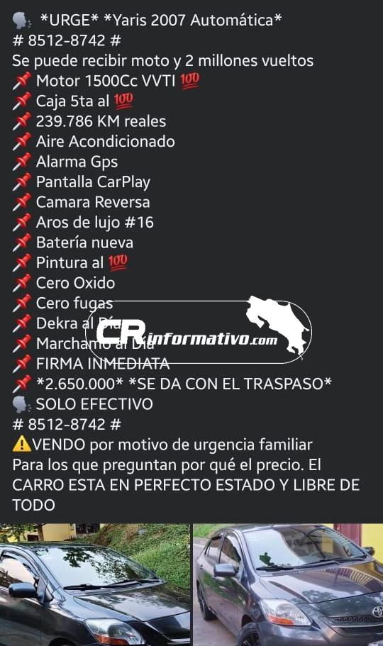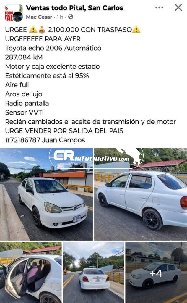 De acuerdo con el informe emitido por esta sede del OIJ, los sujetos, en apariencia, realizan esta publicación en diferentes páginas de la red social Facebook, con el fin de que, personas interesadas los contacten y logren agendar una cita para ver el vehículo; una vez realizado esto, los sospechosos les solicitan a las víctimas llevar el dinero en efectivo, principalmente en dólares, siendo qué, una vez en el lugar, presuntamente los sujetos los abordan, supuestamente de forma violenta y con el aparente uso de armas de fuego los despojan del dinero y celulares.