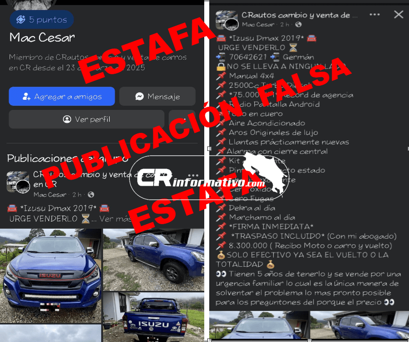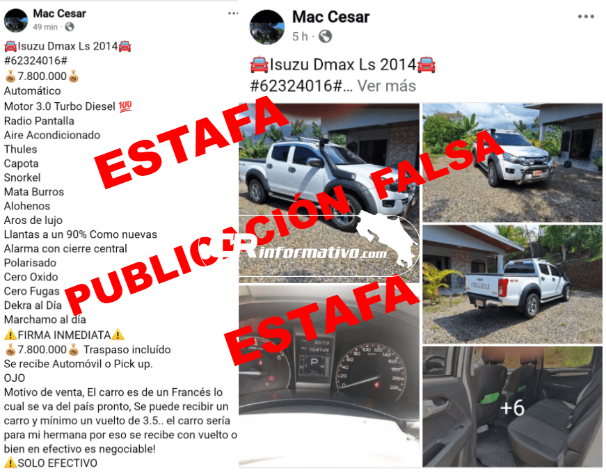 Agentes de la Delegación Regional de Cartago del Organismo de Investigación Judicial (OIJ), alertan a la ciudadanía principalmente de esta provincia, acerca de una serie de publicaciones presuntamente falsas que circulan mediante redes sociales, donde personas informan sobre la supuesta venta de un vehículo marca Isuzu, modelo Dimax a muy bajo precio.