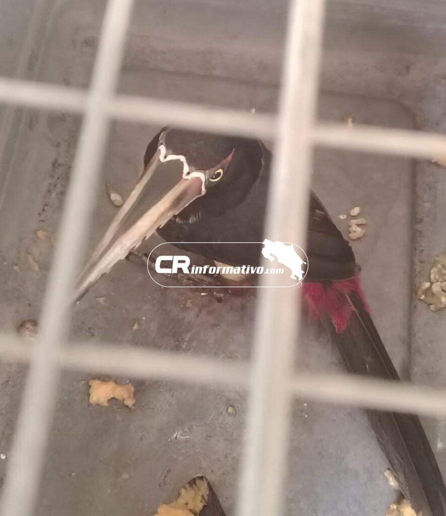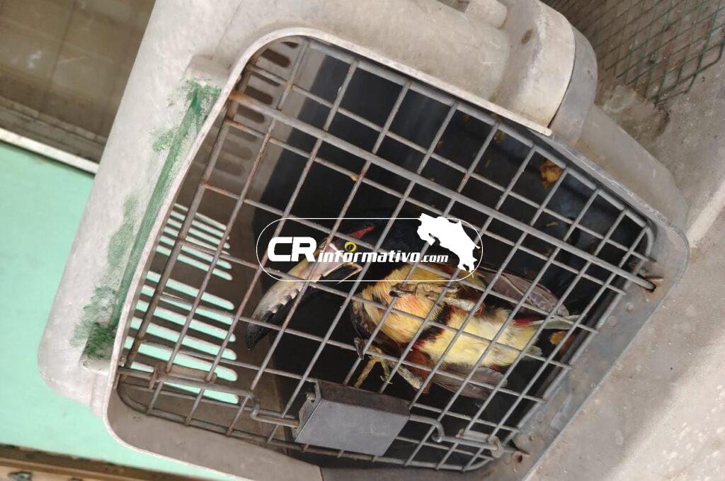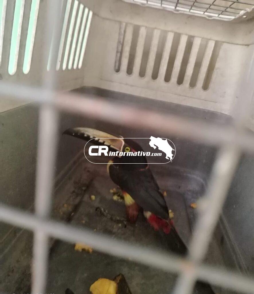 Al acercarse se dieron cuenta de que era un tucán collarejo, el cual estaba desorientado y presentaba un golpe en una de sus alas, por lo que no se descarta qué tuviera alguna fractura.
