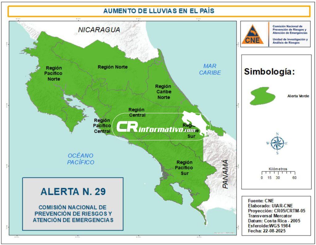 La Comisión Nacional de Emergencias (CNE) informó este viernes la declaratoria de Alerta Verde en todo el territorio nacional, debido a la influencia de la Zona de Convergencia Intertropical, una vaguada y el alto contenido de humedad, condiciones que favorecen el desarrollo de aguaceros y tormentas eléctricas.