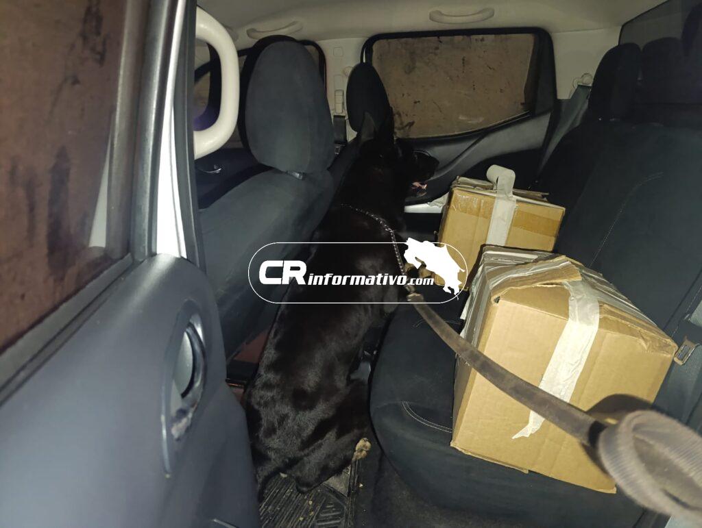 Es por ello que le dieron seguimiento y, 200 metros antes de ingresar al entronque para salir a La Guácima, dicho vehículo fue interceptado por los miembros de la Fuerza Pública, tras lo cual observaron dos cajas en el asiento trasero que, aparentemente, contenían marihuana.