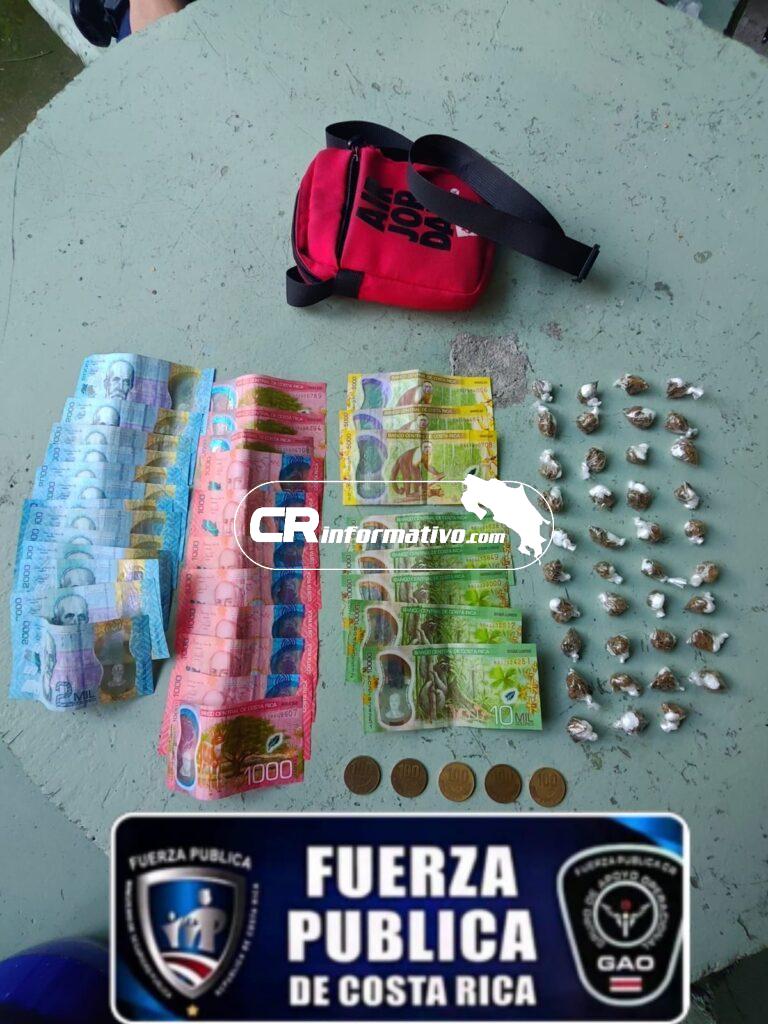 El sujeto, al notar la presencia policial, arrojó una bolsa con 39 dosis de marihuana, las cuales le fueron decomisadas, así como 102.500 colones que portaba al momento de la intervención, y que presuntamente es fruto de la venta de drogas en ese lugar.