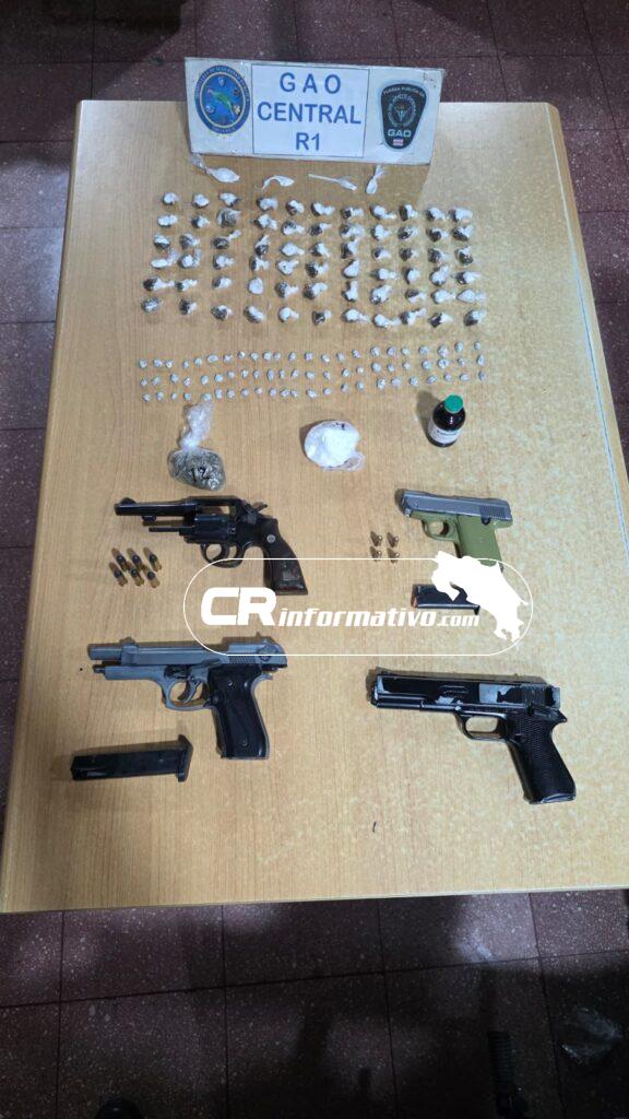 Asimismo, durante un patrullaje en el mismo sector, oficiales observaron a varios sujetos que huyeron hacia una cancha de fútbol, logrando ser interceptados entre unos árboles. Aunque tras una revisión preventiva no se les ubicaron objetos ilícitos, en un basurero cercano los policías encontraron una bolsa que contenía dos armas de fuego —una pistola con cargador y cuatro municiones, y un revólver calibre .38 con seis municiones—, así como dos armas menos letales y droga de diferentes tipos.