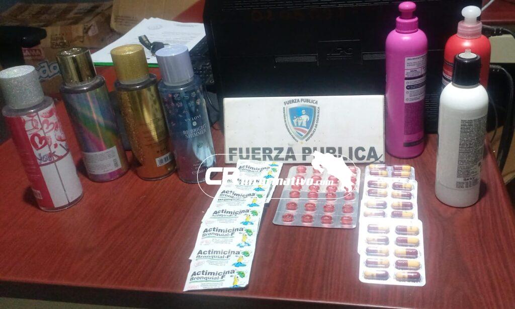 Por su parte, oficiales destacados en el distrito de San José de Upala, durante un operativo realizado por la comunidad de El Delirio, evitaron que un costarricense introdujera al país 50 pastillas de diversos tipos, además de un centenar de prendas de vestir, varios pares de zapatos, bolsos para mujer y diversos cosméticos.