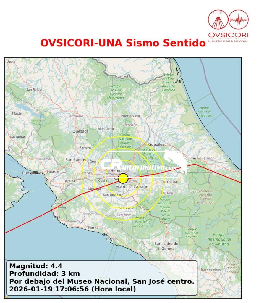 Un sismo de magnitud 4,4 fue percibido la tarde de este lunes 19 de enero de 2026 en amplias zonas del territorio nacional, según el reporte del Observatorio Vulcanológico y Sismológico de Costa Rica (Ovsicori-UNA).