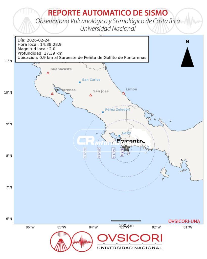 El evento se ubicó a una profundidad de 17.39 kilómetros, con epicentro a 0.9 kilómetros al suroeste de Peñita de Golfito, en la provincia de Puntarenas. Las coordenadas registradas fueron latitud 8.2447 y longitud -82.9553.