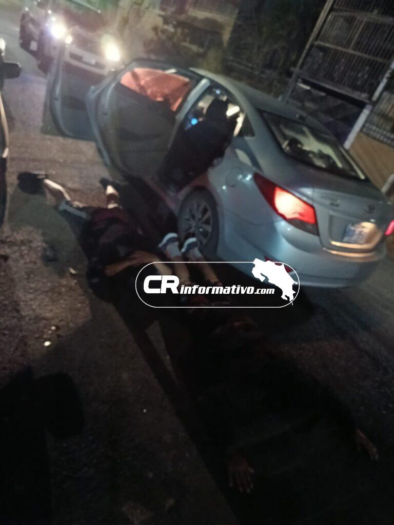 Dos sujetos sospechosos de asaltar a un conductor y robarle su vehículo, además de una tarjeta de débito, fueron aprehendidos por oficiales de la Fuerza Pública la madrugada de este martes en el distrito de San Rafael Arriba de Desamparados.