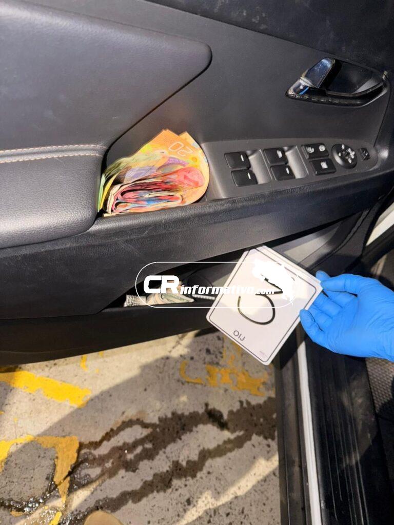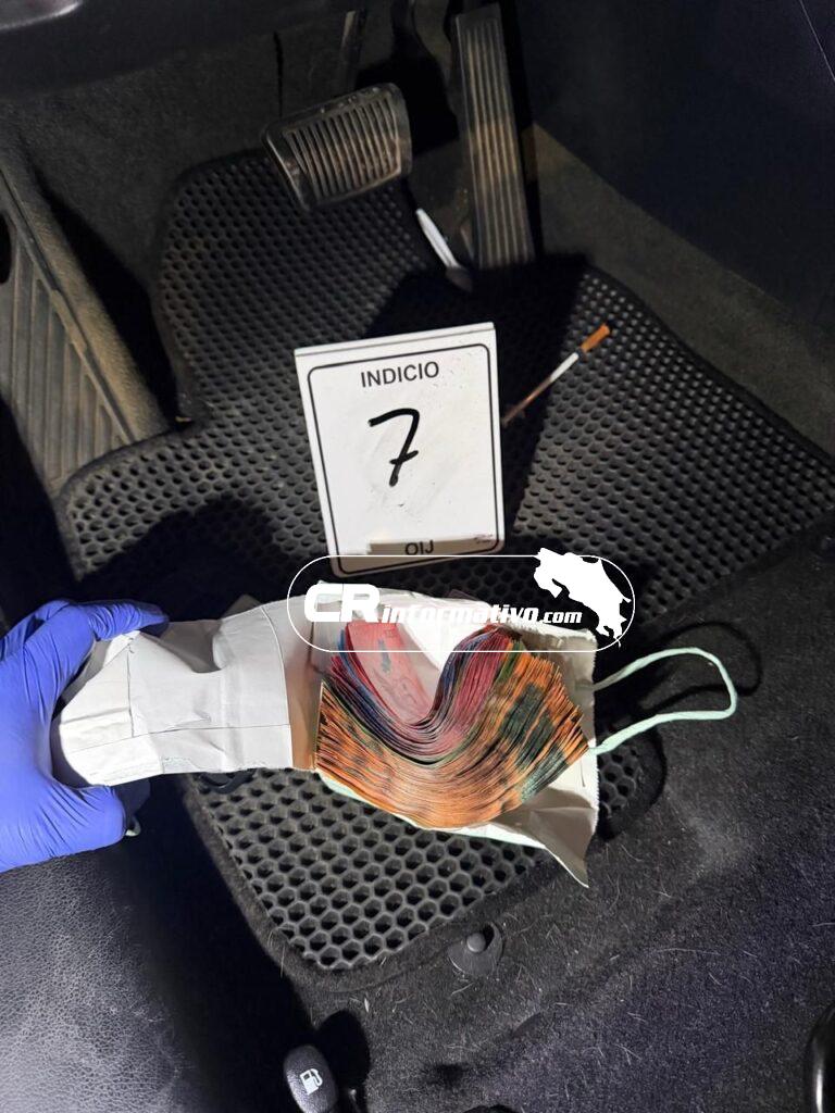 El imputado fue interceptado por agentes del Organismo de Investigación Judicial (OIJ) cuando se desplazaba por las cercanías del peaje de sobre la ruta 32, a bordo de un vehículo blanco en el que transportaba de manera oculta ₡15.499.000.00 y $2.153; además de marihuana, joyas y tres teléfonos celulares. Estos elementos fueron decomisados como parte de la investigación.