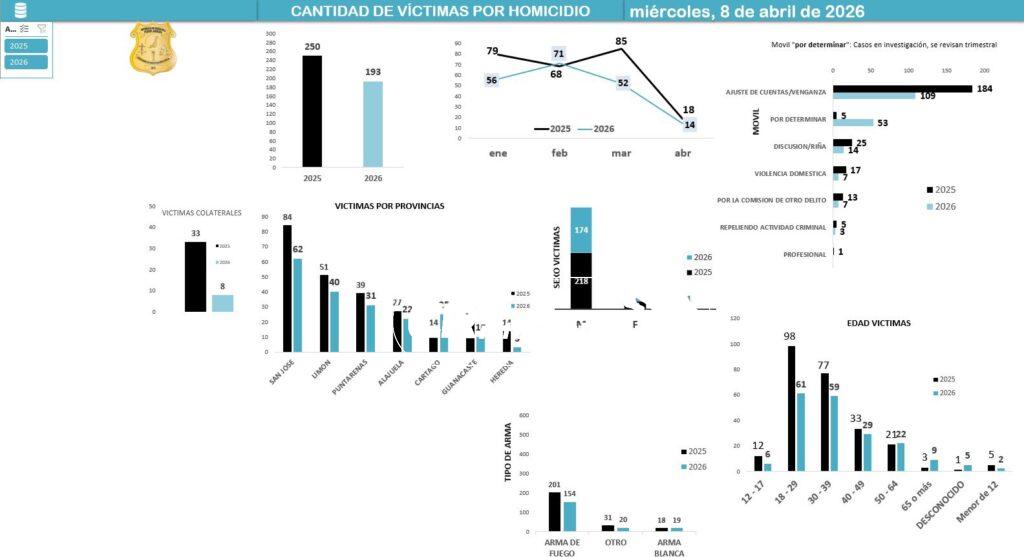 De acuerdo con el registro, en 2025 se contabilizaban 250 víctimas a esta misma fecha, mientras que en 2026 la cifra se ubica en 193, lo que representa una reducción de 57 casos. La tendencia a la baja se refleja en la mayoría de los indicadores analizados por el OIJ, aunque con variaciones puntuales en algunos segmentos.