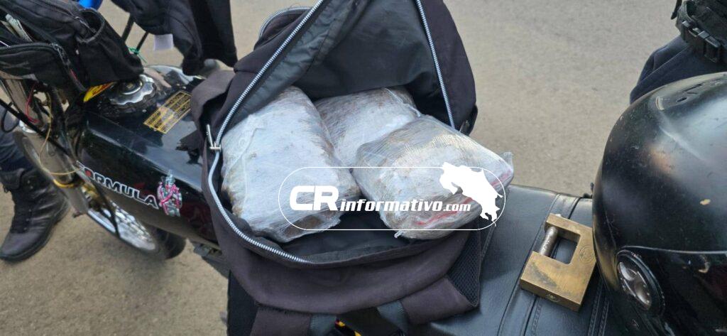 Luego de una rápida persecución, los agentes lograron interceptar la motocicleta, la cual era conducida por un sujeto de apellido Rodríguez. Durante la intervención, el individuo mostró de manera voluntaria un bolso en el que transportaba tres paquetes con aparente marihuana.