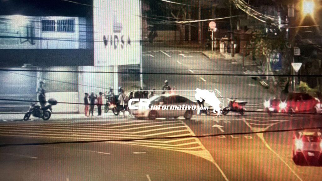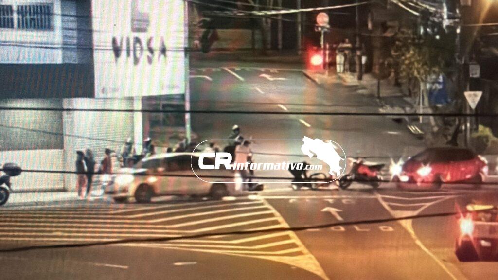 De acuerdo con el relato, una pareja que se desplazaba en motocicleta en dirección hacia Plaza González Víquez fue colisionada luego de que un vehículo irrespetara una señal de alto, provocando el choque contra el costado del automóvil. Tras el incidente, el conductor involucrado abandonó el lugar.