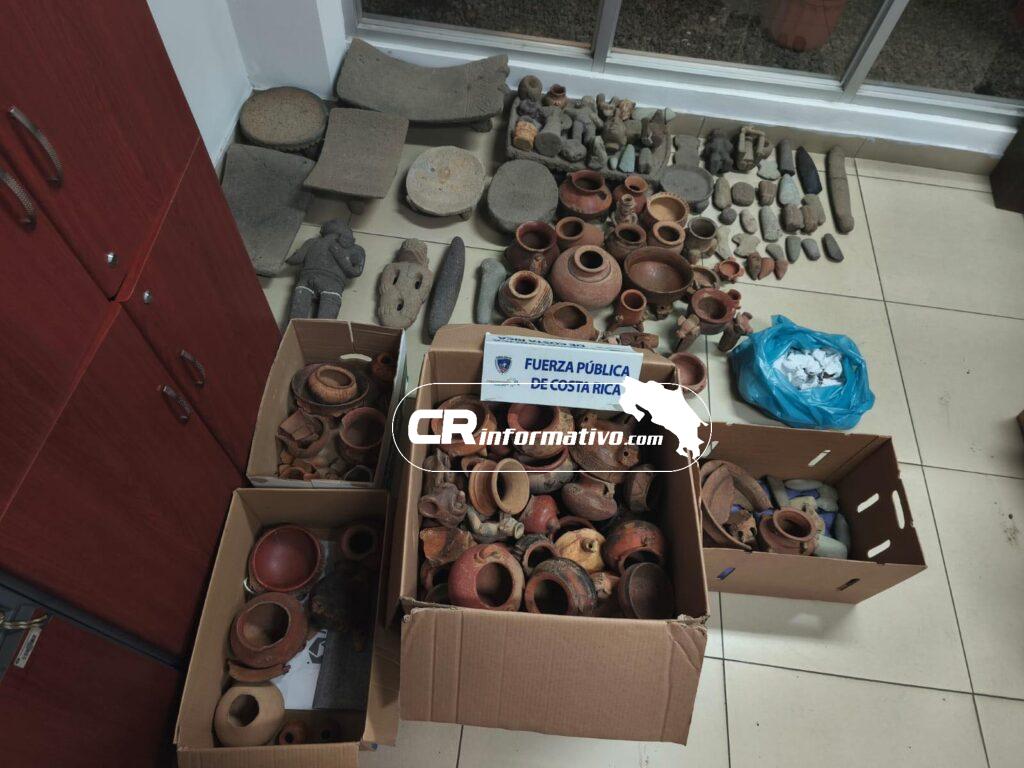 Oficiales de la Fuerza Pública ubicaron varios objetos con aparente valor arqueológico dentro de una vivienda en el sector de Pilas de San Isidro de Alajuela, como parte de una diligencia administrativa.