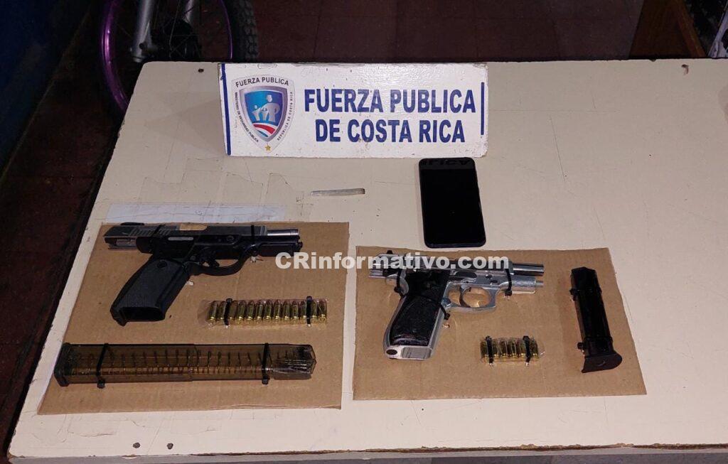 La Policía rastreó el área por donde pasó el sospechoso y logró ubicar dos armas de fuego, una de ellas con un cargador largo, de uso prohibido en el país, mantenía 13 municiones, la otra pistola presentaba su serie limada y un cargador con seis municiones.