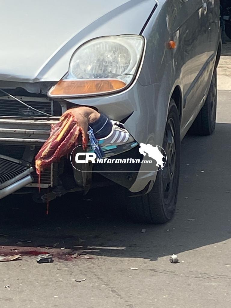 El choque se dio en la parte delantera del automóvil, con el filo del parachoques atrapando la pierna del motociclista, dejándola colgando sobre el auto.