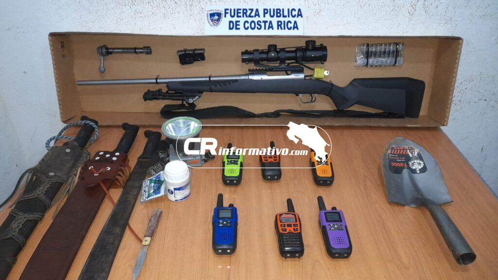 Los oficiales ubicaron un arma larga con mira telescópica, radios de comunicación, una pala, nueve perros de cacería, una linterna; tres machetes, un frasco de insecticida y varios camarones de río. Además, el tepezcuintle que afortunadamente se encontraba vivo.