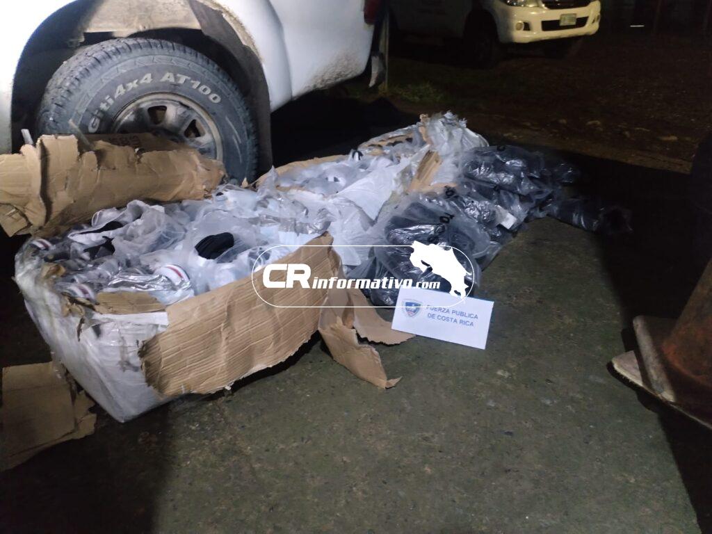 El decomiso tuvo lugar en el cruce de La Perla y Quebradón, distrito de Delicias de Upala, sitio en el que los oficiales interceptaron un automóvil conducido por un costarricense de apellido Mairena, quien transportaba cuatro bultos que contenían 48 pares de tenis y 21 pares de sandalias crocs, todo lo cual podría estar valorado en aproximadamente 1.500.000 colones.