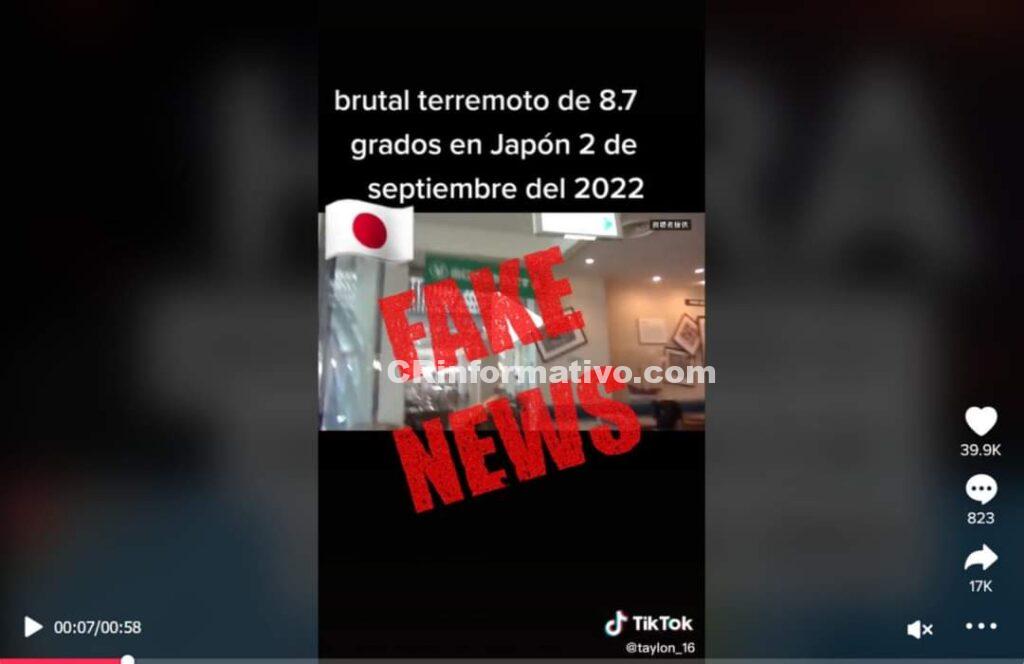 El usuario de Tik Tok @taylon_16 ha viralizado información sobre un supuesto terremoto de magnitud 8.7 ocurrido en Japón el día de hoy. Aclaramos que esto es totalmente FALSO.